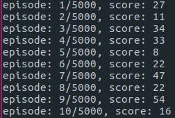 print("episode: {}/{}, score: {}"