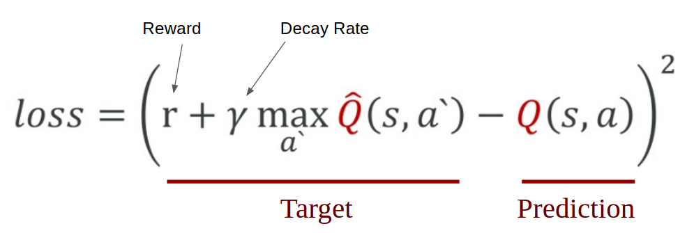 In order to logically represent this intuition and train it, we need to express this as a formula that we can optimize on. The loss is just a value that indicates how far our prediction is from the actual target. For example, the prediction of the model could indicate that it sees more value in pushing the right button when in fact it can gain more reward by pushing the left button. We want to decrease this gap between the prediction and the target (loss). We will define our loss function as follows: