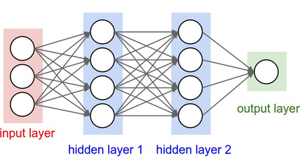 Note that the neural net we are going to use is similar to the diagram above. We will have one input layer that receives 4 information and 3 hidden layers. But we are going to have 2 nodes in the output layer since there are two buttons (0 and 1) for the game.