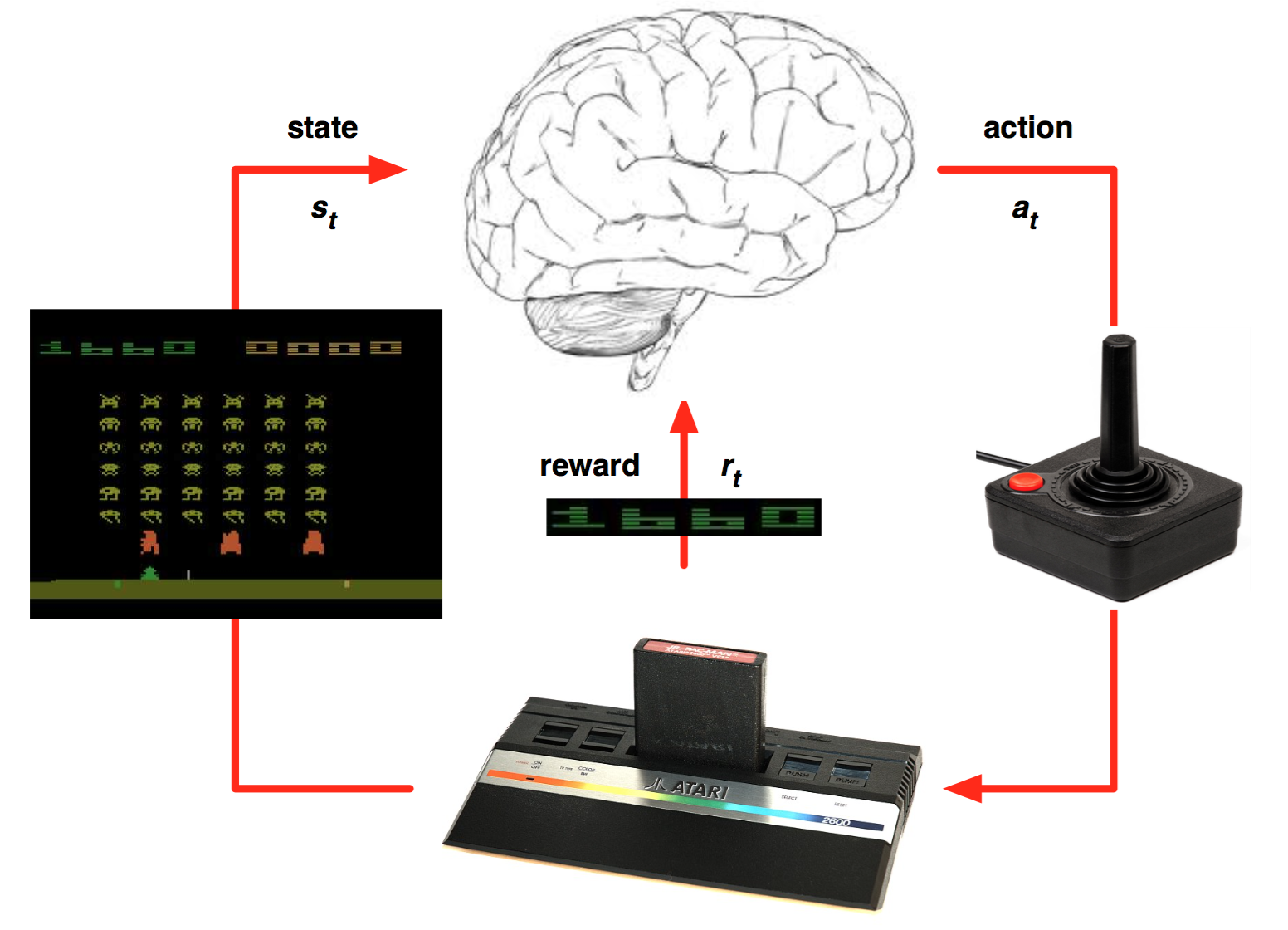 Reinforcement Learning is a type of machine learning that allows you to create AI agents that learn from the environment by interacting with it. Just like how we learn to ride a bicycle, this kind of AI learns by trial and error. As seen in the picture, the brain represents the AI agent, which acts on the environment. After each action, the agent receives the feedback. The feedback consists of the reward and next state of the environment. The reward is usually defined by a human. If we use the analogy of the bicycle, we can define reward as the distance from the original starting point.